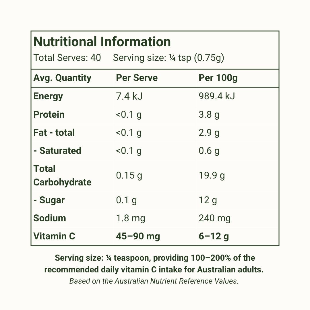 We recommend taking ¼ teaspoon daily to reach your vitamin C intake. You should get roughly 40 serves per 30g pouch and 10 serves per 7g pouch.